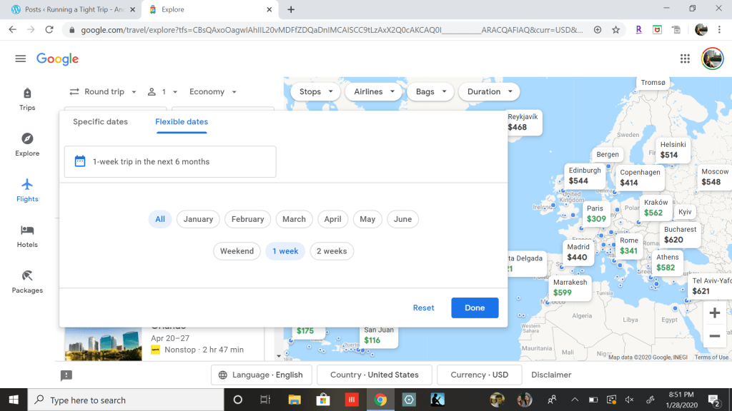 To get even further into playing around with Google Flights (and this is what I spend all of my time doing, oops!), you can go in and select your departing airport, and then just leave your destination field empty. Then you can go to “flexible dates,” and specify if you’re wanting to go for one weekend, for one week, or for two weeks of travel. You can have it set to search for those parameters six months away, or you can narrow it down to, “Oh, I want to travel from Chicago to anywhere for one week in May.” You can only look six months in advance, but it’s still fun!